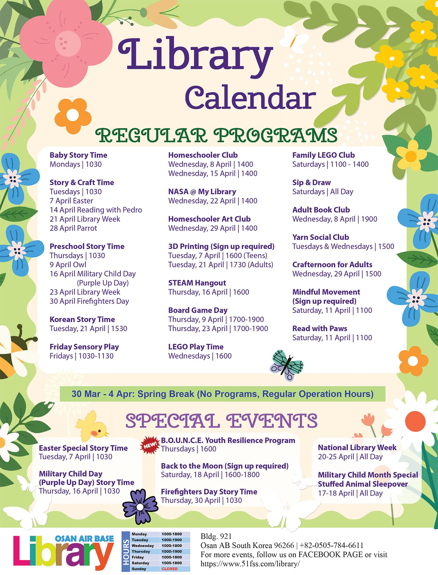 ī« Mondays & Wednesdays & Fridays & Saturdays 1000-1800Tuesdays & Thursdays 1000-1900Closed: Sundays ļ Bldg. 921  DSN 784-6611COMM: 0505-784-6611 ļ Facebook Library Services Over 29,000 collections to check out Reference Materials CLEP & Dantes Materials DVDs, Magazines, Newspapers, Game Packs & Board Games 15 Computers, 6 NIPRNET Computers, 3 Teen Computers, & 1 Kid Computer 3 Scanners, Copier, Printer WiFi Conference Room & Quiet Study Area Overdrive/Libby/Mango Online language⦠many more. Get updates, share photos, and ask questions on the Library Facebook Page. Get updates, share photos, and ask questions on the Library Facebook Page Over 29,000 Collections To Check Out Visit The Online Catalog Library Subscription List
