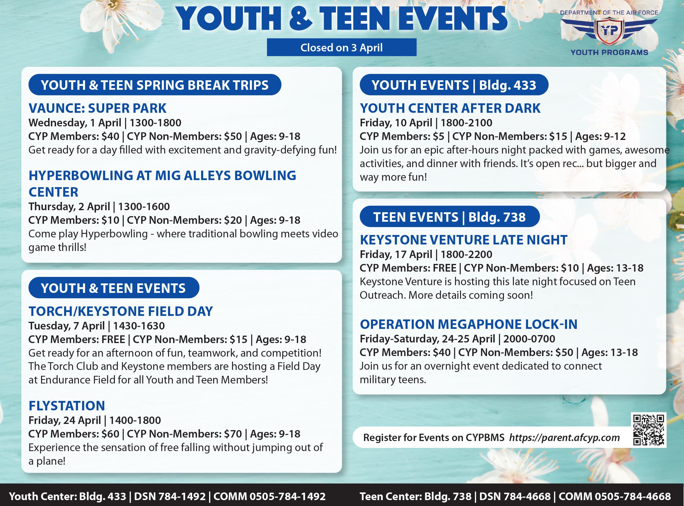 All registrations and payments for Youth Programs are done online through our CYPBMS Parent Portal. To set up an account, please complete the CYPBMS Account Creation form and send it into our org box email:Ā 51fss.fsyy.youthcenter@us.af.mil. You may also register in-person in the Youth and Teen Center or contact us for assistance at 784-1492.