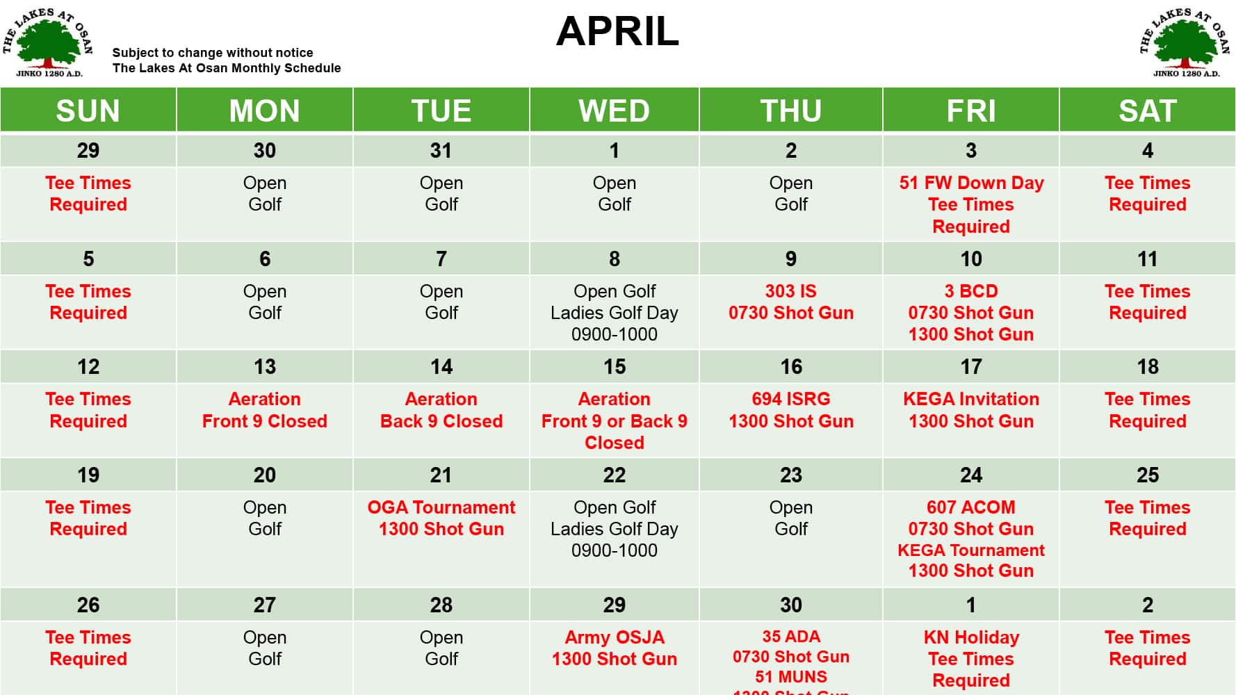 Golf Course Annual Schedule